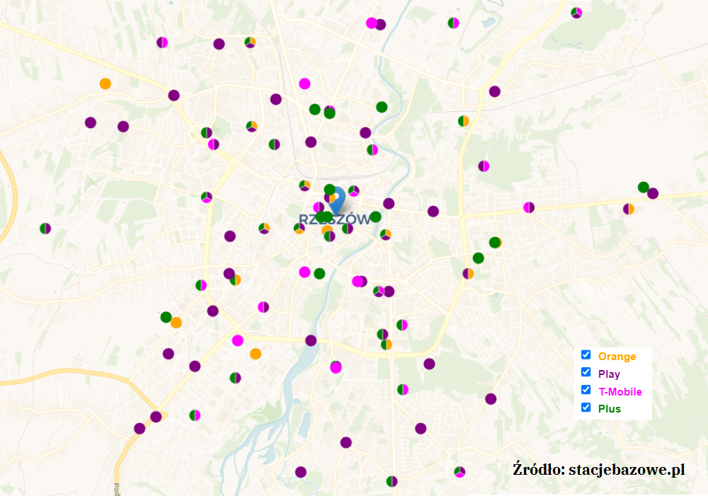➡️ Dane wynikają z faktycznie działających stacji bazowych zlokalizowanych na terenie Rzeszowa i okolic.