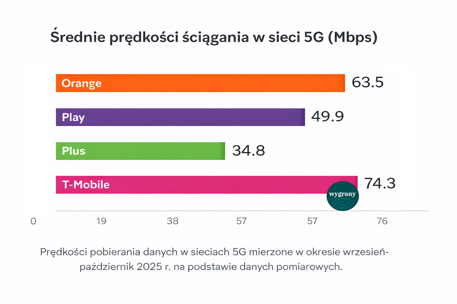 Prezentowane dane dotyczą średnich prędkości pobierania danych w sieci 5G na terenie Rzeszowa i mają charakter poglądowy. Oparte są na zagregowanych pomiarach użytkowników oraz publicznych raportach jakości sieci (m.in. Opensignal).