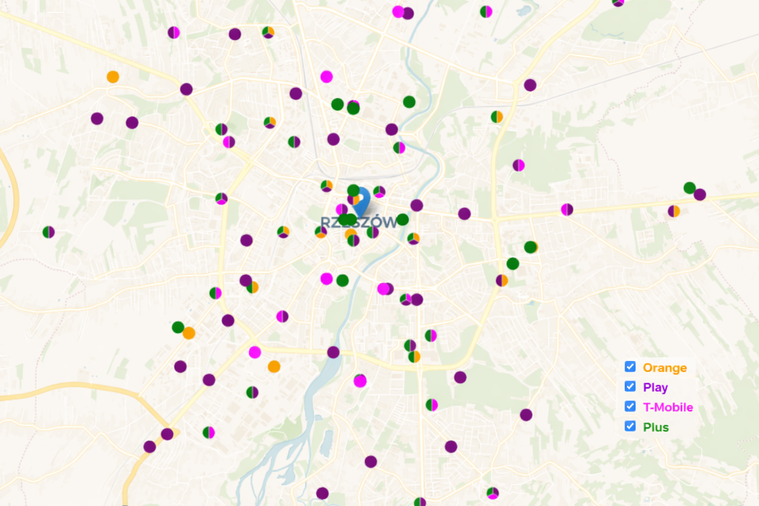 Dane wynikają z faktycznie działających stacji bazowych zlokalizowanych na terenie Rzeszowa i okolic.